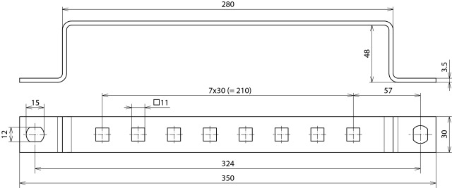 Szyna uziemiająca do przykręcania do konstrukcji stalowych. Do przyłączania płaskowników z otworami lub drutów okrągłych za pomocą np. łączników KS. Wykonanie z 1x 8 przyłączeniami– otwory Ø11 x 11 mm.