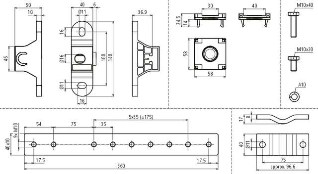 Nieiskrząca szyna wyrównawcza do stref zagrożonych wybuchem Ex do integracji drutów metalowych i przewodów z połączeniami wyrównawczymi piorunochronnymi zgodnie z VDE 0185-305-3 (IEC 62305-3) oraz z ochronnymi i funkcjonalnymi połączeniami wyrównawczymi zgodnie z DIN VDE 0100 część 410/540. Do stosowania w strefach Ex 1 i 2 (gazy, opary, mgły) oraz w strefach Ex 21 i 22 (pyły), grupa wybuchowości IIC (współczynnik bezpieczeństwa 1) zgodnie z CLC 50703-2. Zgodnie z klasą temperaturową T4 oraz DIN EN 62561-1 (VDE 0185-561-1) klasa obciążalności prądowej H (100 kA). Zabezpieczenie śruby przed samoczynnym luzowaniem zgodnie z VDE 0185-305-3 uzupełnienie 2. Dozwolone stosowanie zarówno wewnątrz, jak i na zewnątrz. Aby uniknąć rozszczepień w strefie zagrożenia wybuchem, zaleca się zastosowanie ocynowanych zaciskanych końcówek kablowych z niklową warstwą blokującą. Produkt wyposażony jest w następujące przyłącza: 1x płaskie (M10 x 40 mm z podkładką sprężystą) i 5x końcówka kablowa (M10 x 20 mm z podkładką sprężystą).