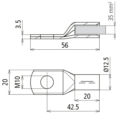 Zaciskana końcówka kablowa zgodnie z DIN 46235, przekrój 35 mm² M10 Cu/galwanizowana cyną z niklową warstwą blokującą. Aby uniknąć rozszczepień w strefie zagrożenia wybuchem, zaleca się zastosowanie ocynowanych zaciskanych końcówek kablowych z niklową warstwą blokującą.