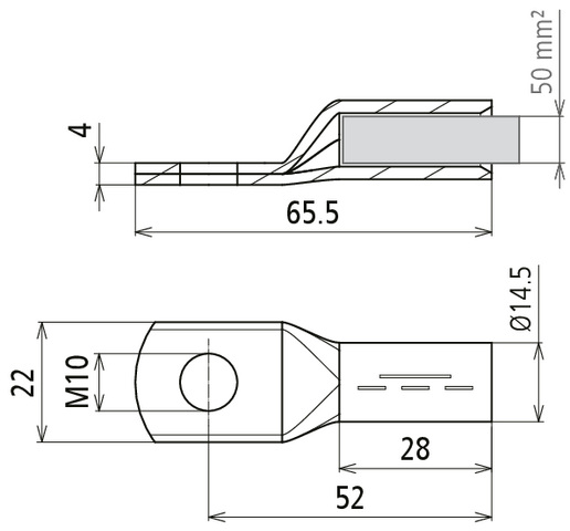 Zaciskana końcówka kablowa zgodnie z DIN 46235, przekrój 50 mm² M10 Cu/galwanizowana cyną z niklową warstwą blokującą. Aby uniknąć rozszczepień w strefie zagrożenia wybuchem, zaleca się zastosowanie ocynowanych zaciskanych końcówek kablowych z niklową warstwą blokującą.