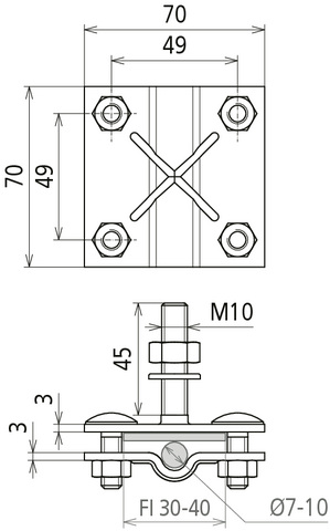 Zacisk przyłączeniowy z gwintowanym sworzniem do wypustu uziemiającego M10 o śr. 7-10 mm (drut) / szer. 30-40 mm (płaskownik), stal HDG AK 7.10 FL40 GBM10X45 STTZN