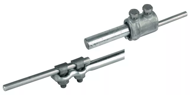 Pręty uziemiające – zestaw, zgodny z normą DIN EN 62561-(1+2), kompletny z mufą rozłączną i zaciskami przyłączeniowymi (śruby KS). Wykonanie ze stali ocynkowanej ogniowo z mufą rozłączną, ciśnieniowy odlew cynkowy.