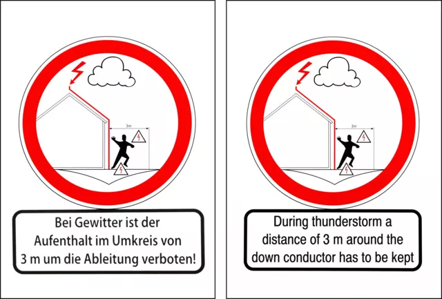 Tabliczka ostrzegawcza „Bei Gewitter ist der Aufenthalt im Umkreis von 3 m um die Ableitung verboten!” do stosowania w obszarach, gdzie istnieje ryzyko napięcia krokowego i dotykowego dla istot żywych, spełnia wymagania normy DIN EN 62305-3 (VDE 0185-305-3). Wykonanie dwujęzyczne (przód w języku niemieckim / tył w języku angielskim).