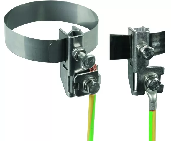 Obejma taśmowa zabezpieczona przed samoczynnym poluzowaniem zgodnie z normą DIN EN 62561-1, do integracji rur z ochronnym i funkcjonalnym połączeniem wyrównawczym zgodnie z DIN VDE 0100 część 410/540 i połączeniem wyrównawczym piorunochronnym spełniającym wymagania normy DIN EN 62305-3 (VDE 0185-305-3). Wykonanie kompletne, z bezstopniowo regulowaną taśmą napinającą ze stali nierdzewnej, do przyłączenia 1 przewodu, drut okrągły Ø10 mm lub 1-2 przewodów, drut okrągły Ø6-8 mm lub 4-50 mm² (drut / wielodrutowo).