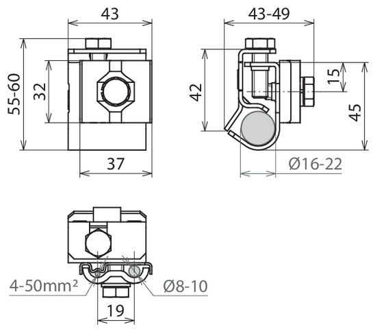 Zacisk rynnowy, do obciążalnego prądem piorunowym łączenia lub podłączania uziemienia anteny (np. 16 mm2) w punkcie przecięcia z rynną dachową.