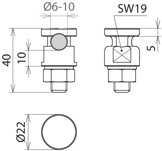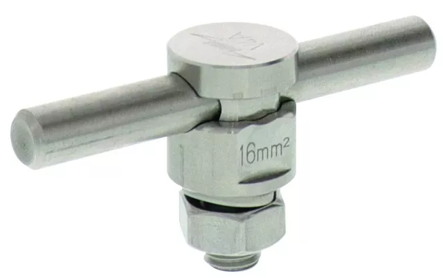 Łączniki KS spełniające wymagania normy DIN EN 62561-1, do obciążalnego prądem piorunowym podłączania drutów okrągłych, np. do profili płaskich, obejm do rur spustowych lub innych elementów instalacji ochrony odgromowej. Wykonanie jednoczęściowe, stal nierdzewna (V4A), ze śrubą i nakrętką M10 i prowadnicą z powierzchnią na klucz płaski.