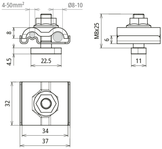 Zacisk uziemiający UNI spełniający wymagania normy DIN EN 62561-1, do integracji systemów montażowych np. instalacji fotowoltaicznych, z połączeniem wyrównawczym funkcjonalnym / uziemieniem funkcjonalnym (kolor przewodu ewentualnie czarny) i połączeniem wyrównawczym piorunochronnym zgodnie z DIN EN 62305-3 (VDE 0185-305-3). Płytka stykowa (element pośredni) wykonana ze stali nierdzewnej umożliwia łączenie przewodów z różnych materiałów (miedź, aluminium, stal ocynkowana ogniowo i stal nierdzewna) do zwykłych systemów montażowych, np. wykonanych z aluminium, bez występowania korozji stykowej. Wykonanie ze śrubą z łbem młotkowym M8 x 25 mm, nakrętką samohamowną i podwójną płytką dociskową np. do połączeń szeregowych profili.