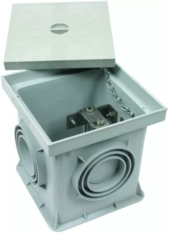 Skrzynka pobiercza do montażu poniżej poziomu gruntu, do odłączania przewodu odprowadzającego od instalacji uziemiającej podczas pomiaru. Wykonanie z tworzywa sztucznego z wbudowanym łatwo dostępnym złączem probierczym.