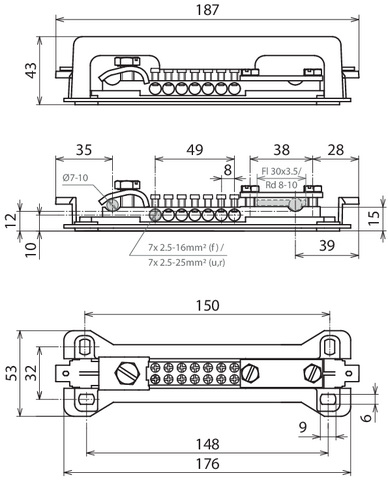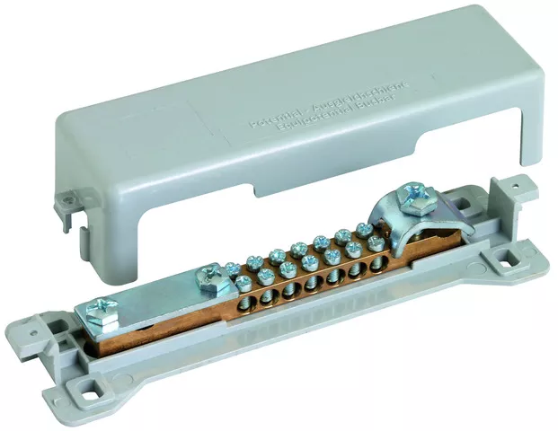 Szyna wyrównawcza do połączeń wyrównawczych. Wykonanie MS, pokrywa z tworzywa sztucznego, kolor szary.