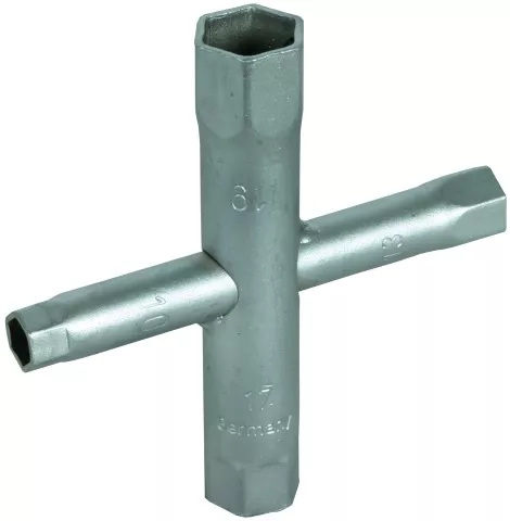 Klucz krzyżowy nasadowy do uniwersalnego stosowania w instalacjach ochrony odgromowej. Z kluczami w czterech rozmiarach (SW 10, 13, 17 und 19).