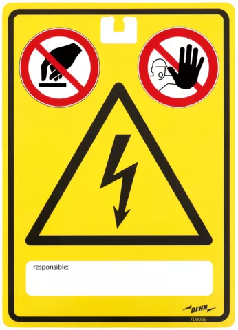 Tabliczka ostrzegawcza z ramką do zawieszania do słupków z tworzywa sztucznego i napisem „Achtung Spannung – Berühren sowie Zutritt für Unbefugte verboten”.