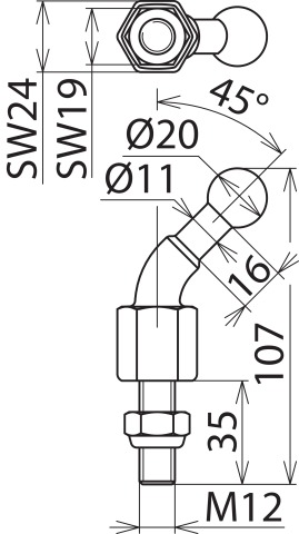 Kulowy punkt mocowania o śr. 20 mm, kątowy 45°, z gwintowanym kołkiem i nakrętką M12x35 KFP 20 W45 M12 35SSM