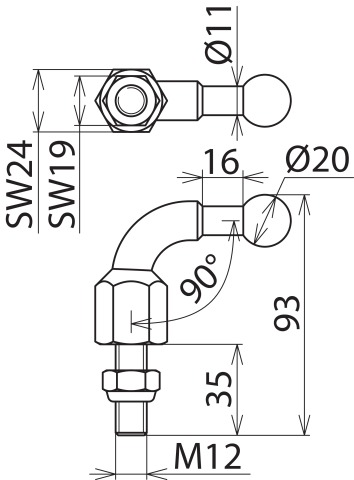 Kulowy punkt mocowania o śr. 20 mm, kątowy 90°, z gwintowanym kołkiem i nakrętką M12x35 KFP 20 W90 M12 35SSM