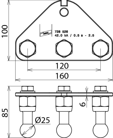 Płyta przyłączeniowa uziemienia do montażu na zacisku przyłącza uziemienia antyobrotowym PK1, z 3 kulowymi punktami mocowania, jako punkt przyłączeniowy zgodnie z DIN VDE 0683-100 (EN/IEC 61230). Proste przyłącze gałęzi fazy, jednobiegunowe. Wysoka obciążalność prądem zwarciowym.