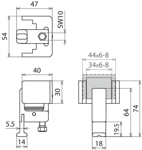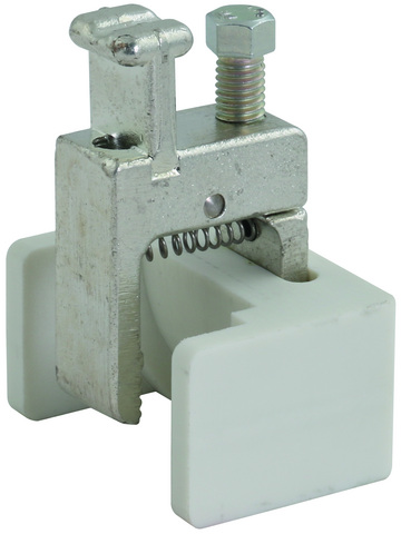 Zacisk adaptacyjny uziemiający ze sprężynowym elementem dociskowym. Ze sworzniem T-kształtnym i sześciokątną śrubą ustalającą SW10. Do wkładania za pomocą uchwytu uziemiającego VI i mocowania za pomocą uchwytu do wkręcania z elastycznym trzpieniem.