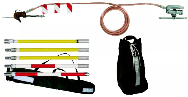 Zestaw do uziemiania i zwierania do łatwego transportu w samochodzie (praca poza skrajnią) zgodnie z DIN VDE 0683-100 (EN/IEC 61230) do uziemiania i zwierania instalacji elektrycznych górnej sieci jezdnej w miejscu pracy zgodnie z DIN VDE 0105-100 (EN 50110). Zawiera zestaw teleskopowego drążka uziemiającego (6-częściowy) i dwa jednobiegunowe urządzenia do uziemiania i zwierania, 8,5 m długości, wykonanie z pokrętłem T-kształtnym oraz torbę płócienną.