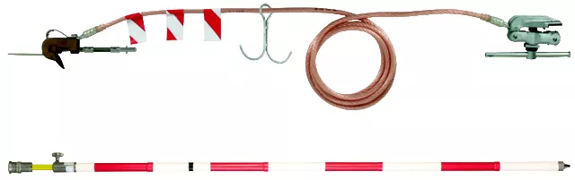 Zestaw do uziemiania i zwierania (bez profili) zgodnie z DIN VDE 0683-100 (EN/IEC 61230) do uziemiania i zwierania instalacji elektrycznych w miejscu pracy zgodnie z DIN VDE 0105-100 (EN 50110). W zestawie z teleskopowym drążkiem uziemiającym i jednobiegunowym urządzeniem do uziemiania i zwierania, 12 m długości, z hakiem, wykonanie z pokrętłem T-kształtnym.