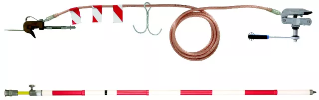 Zestaw do uziemiania i zwierania (bez profili) zgodnie z DIN VDE 0683-100 (EN/IEC 61230) do uziemiania i zwierania instalacji elektrycznych w miejscu pracy zgodnie z DIN VDE 0105-100 (EN 50110). W zestawie z teleskopowym drążkiem uziemiającym i jednobiegunowym urządzeniem do uziemiania i zwierania, 12 m długości, z hakiem, wykonanie z kluczem zapadkowym.