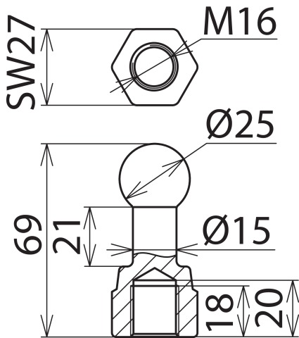 Kulowy punkt mocowania o śr. 25 mm, prosty, z gwintem wewnętrznym M16 KFP 25 M16
