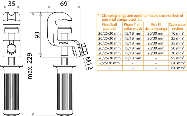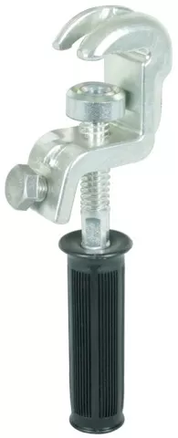 Uniwersalny zacisk uziemiający z rękojeścią z tworzywa sztucznego jako element przyłączeniowy po stronie uziemienia zgodnie z DIN VDE 0683-100 (EN/IEC 61230) do kulowych punktów mocowania, T-kształtnych punktów mocowania, drutów i płaskowników, do wyposażenia po stronie uziemienia przewodów uziemiających i zwierających. Wykonanie antyobrotowe PK 1.