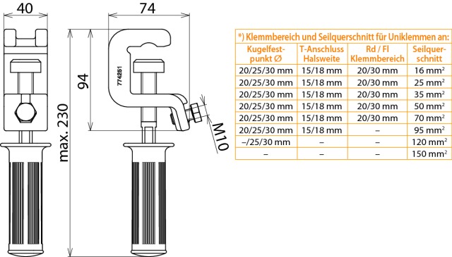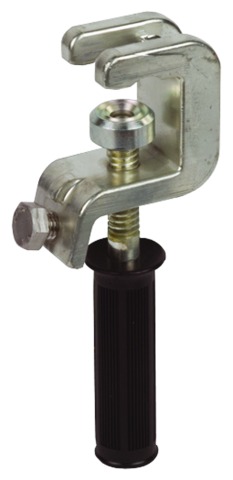 Zacisk uniwersalny z uchwytem z tworzywa sztucznego, zgodnie z DIN VDE 0683-100 (EN/IEC 61230) do uziemienia i zwierania płaskowników i drutów do 30 mm i kulowych punktów mocowania, kula o Ø = 25 mm.