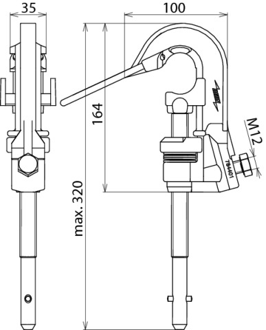 Śrubowy zacisk fazowy (z uchwytem mocującym) z długim gwintowanym trzpieniem i poprzecznym kołkiem jako element przyłączeniowy po stronie fazy zgodnie z DIN VDE 0683-100 (EN/IEC 61230) do linii napowietrznych, do wyposażenia przewodów uziemiających i zwierających. Wykonanie antyobrotowe PK 1.