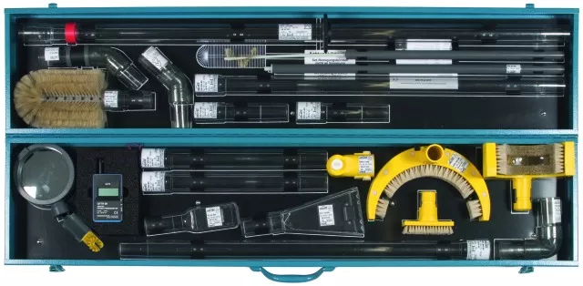 Zestaw do czyszczenia na sucho TRS MS zgodnie z DIN VDE 0682-621 do czyszczenia przez odsysanie elementów pod napięciem do 36 kV / 15 ... 60 Hz, do transformatorów i rozdzielnic w budynkach i na zewnątrz, komplet w odpowiednim futerale transportowym. Specjalnie przystosowane głowice robocze do intensywnego czyszczenia. System złączy wtykowych do szybkiej wymiany głowic roboczych. Z regulacją siły ssania na rękojeści. Przezroczyste rury ssące dla większego bezpieczeństwa.
