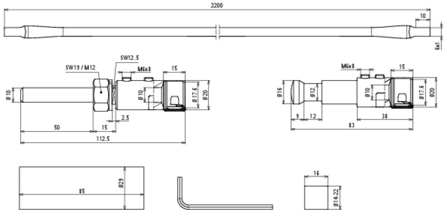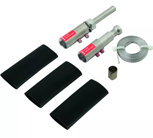Zestaw przyłączeniowy do zakończenia przewodu HVI light na obu końcach, do utworzenia obszaru przyłączeniowego przewodu w rurze wsporczej (odcinek górny) i elementu przyłączeniowego, do którego podłączane są inne elementy zewnętrznego urządzenia piorunochronnego lub instalacji uziemiającej. W zestawie przewód wyrównawczy, sprężyna dociskowa i trzy koszulki termokurczliwe.