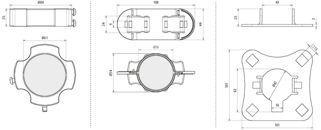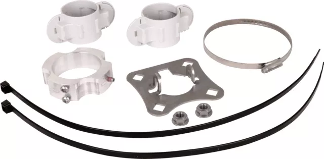 Zestaw mocujący do montażu przewodu HVI light plus lub HVI long na rurach wsporczych HVI long, składający się z płytki przyłączeniowej (poczwórnej) i pierścienia mocującego z obejmą do końcówki przyłączeniowej (wraz z czterema obejmami z tworzywa sztucznego i dwoma opaskami kablowymi do obszaru GRP).