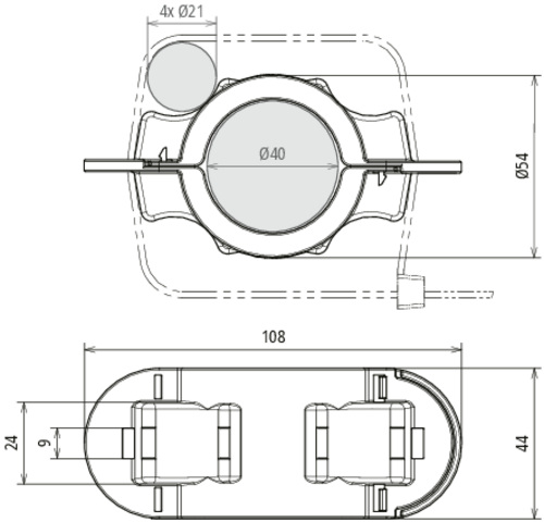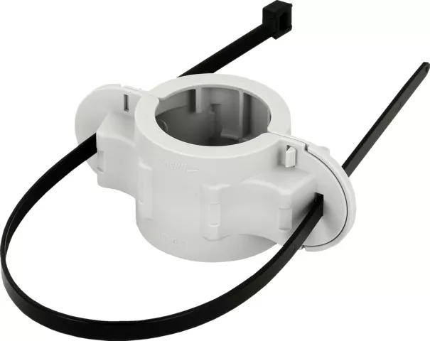Zestaw mocujący do montażu przewodu HVI light plus na rurach wsporczych HVI light plus, składający się z dwóch półskorup i opaski kablowej do mocowania maksymalnie czterech przewodów HVI light plus w obszarze GRP rury wsporczej.