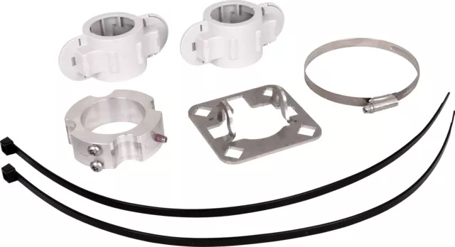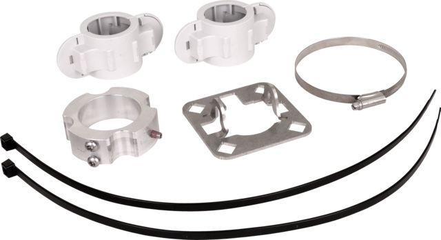 Zestaw mocujący do montażu przewodu HVI light plus na rurach wsporczych HVI light plus, składający się z płytki przyłączeniowej (poczwórnej) i pierścienia mocującego z obejmą do końcówki przyłączeniowej (wraz z czterema obejmami z tworzywa sztucznego i dwoma opaskami kablowymi do obszaru GRP).