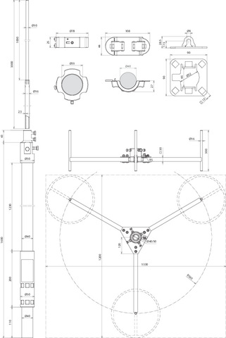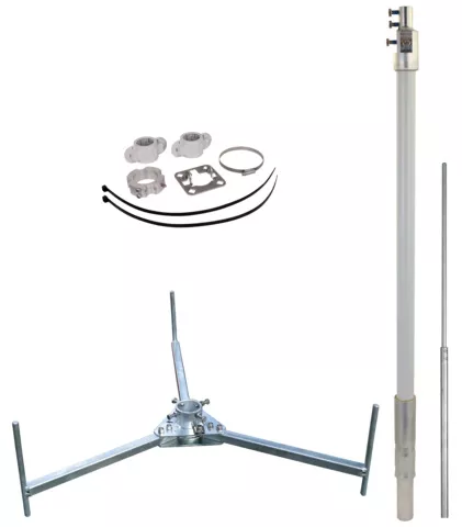 Maszt odgromowy do przewodów HVI light plus, do ustawiania na dachach płaskich, z możliwością kompensacji nachylenia dachu do maks. 10°. Kompletny z poczwórną płytką przyłączeniową do przewodu HVI light plus, z zestawem mocującym do montażu przewodu na statywie na trzech nogach. Wysokość całkowita 4700 mm, w zestawie rura wsporcza GRP/aluminium oraz iglica odgromowa.