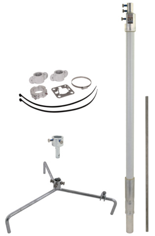 Maszt odgromowy do przewodów HVI light plus, do ustawiania na dachach płaskich, z możliwością kompensacji nachylenia dachu do maks. 10°. Kompletny z poczwórną płytką przyłączeniową do przewodu HVI light plus, z zestawem mocującym do montażu przewodu na statywie na trzech nogach. Wysokość całkowita 2700 mm, w zestawie rura wsporcza GRP/aluminium oraz iglica odgromowa.
