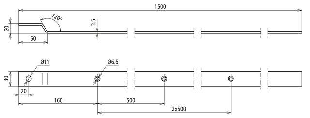Płaskownik przyłączeniowy kątowy, 30x3,5 mm, dł. 1500 mm, otwór 11 mm, stal nierdzewna (V4A) AF 30X3.5 V4A ZW 1500