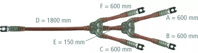 Czterobiegunowe przewody do uziemiania i zwierania zgodnie DIN VDE 0683-100 (EN/IEC 61230), po stronie fazy i uziemienia bez elementów przyłączeniowych, do uzupełnienia odpowiednimi zaciskami, zgodnie z normą DIN VDE 0683-100 (EN/IEC 61230). Przekrój poprzeczny przewodu: 25 mm2, maksymalnym prądzie zwarciowym: 7,0 kA / 0,5 s, Długość przewodu A,B,C,F = 600 mm, E = 150mm oraz D = 1800 mm, nr wariantu VGM214B. Urządzenia do uziemiania i zwierania można zestawiać online za pomocą konfiguratora urządzeń do uziemiania i zwierania na stronie www.dehn.de/de/euk.