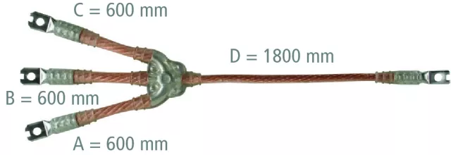 Trójbiegunowe przewody do uziemiania i zwierania zgodnie DIN VDE 0683-100 (EN/IEC 61230), zmniejszony przekrój przewodów, po stronie fazy i uziemienia bez elementów przyłączeniowych, do uzupełnienia odpowiednimi zaciskami, zgodnie z normą DIN VDE 0683-100 (EN/IEC 61230). Przekrój poprzeczny przewodu: 50/25 mm2, maksymalnym prądzie zwarciowym: 14,0 kA / 0,5 s, Długość przewodu A = 600 mm, B = 600 mm, C = 600 mm oraz D = 1800 mm, nr wariantu VN35H5D. Urządzenia do uziemiania i zwierania można zestawiać online za pomocą konfiguratora urządzeń do uziemiania i zwierania na stronie www.dehn.de/de/euk.
