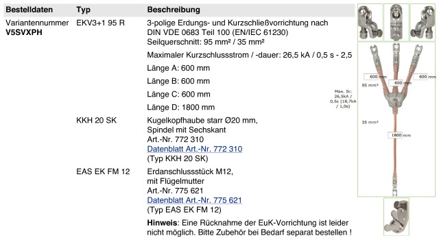 Trójbiegunowe urządzenie do uziemiania i zwierania zgodnie DIN VDE 0683-100 (EN/IEC 61230), przekrój poprzeczny przewodu: 95 mm² / 35 mm², maks. prąd zwarciowy / czas trwania: 26,5 kA / 0,5 s – 2,5; Długość A=B=C= 600 mm, Długość D = 1800 mm; Wyposażony po stronie fazy w 3 zaciski kołpakowe sztywne Ø20 mm, SK z art. nr 772 310 i wyposażony po stronie uziemienia w 1 element przyłączeniowy uziemiający M12, z nakrętką motylkową i art. nr 775 621.