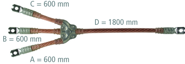 Trójbiegunowe przewody do uziemiania i zwierania zgodnie DIN VDE 0683-100 (EN/IEC 61230), równy przekrój przewodów, po stronie fazy i uziemienia bez elementów przyłączeniowych, do uzupełnienia odpowiednimi zaciskami, zgodnie z normą DIN VDE 0683-100 (EN/IEC 61230). Przekrój poprzeczny przewodu: 25 mm2, maksymalnym prądzie zwarciowym: 7,0 kA / 0,5 s, Długość przewodu A = 600 mm, B = 600 mm, C = 600 mm oraz D = 1800 mm, nr wariantu VNC1S9W. Urządzenia do uziemiania i zwierania można zestawiać online za pomocą konfiguratora urządzeń do uziemiania i zwierania na stronie www.dehn.de/de/euk.