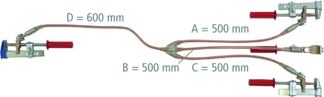 Urządzenie do uziemiania i zwierania z zaciskami imadło do izolowanych szyn zasilających zgodnie z DIN VDE 0683-100 (EN/IEC 61230) do uziemiania i zwierania instalacji elektrycznych w miejscu pracy jako środek wyrównania potencjałów zgodnie z DIN VDE 0105-100 (EN 50110). Inne długości linki można wybrać online za pomocą konfiguratora urządzeń do uziemiania i zwierania na stronie www.dehn.de/de/euk.