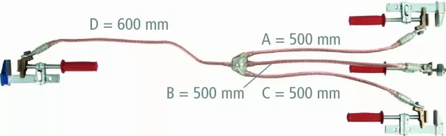 Urządzenie do uziemiania i zwierania z zaciskami imadło do nieizolowanych szyn zasilających zgodnie z DIN VDE 0683-100 (EN/IEC 61230) do uziemiania i zwierania instalacji elektrycznych w miejscu pracy jako środek wyrównania potencjałów zgodnie z DIN VDE 0105-100 (EN 50110). Inne długości linki można wybrać online za pomocą konfiguratora urządzeń do uziemiania i zwierania na stronie www.dehn.de/de/euk.