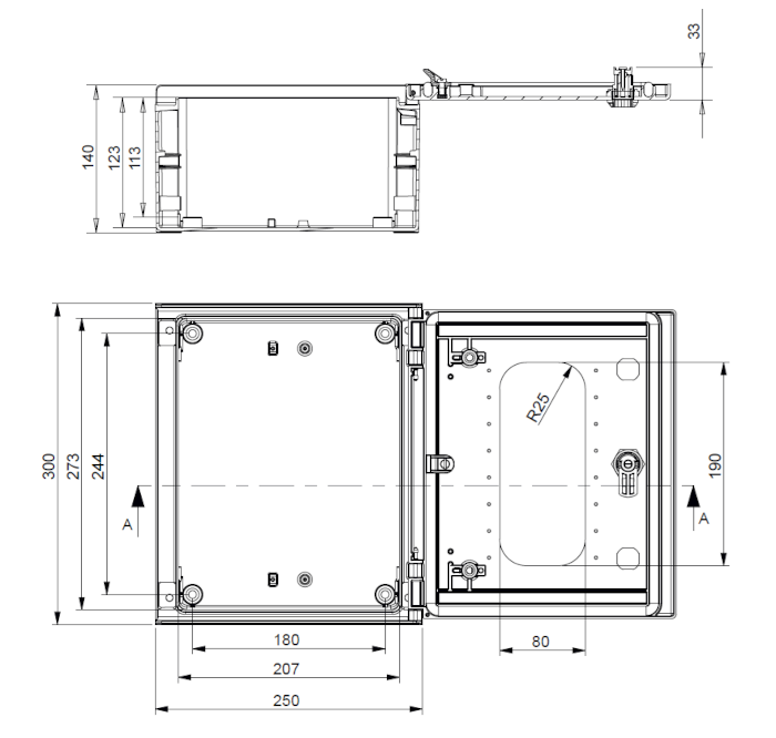 • Od góry obudowa posiada wysunięty daszek który zabezpiecza przed wnikaniem wody kiedy drzwi są otwarte. Chroni on również uszczelkę przed długotrwałym kontaktem z cieczami co mogłoby mieć negatywny wpływ na właściwości poliuretanowej uszczelki przy spadkach temperatury.