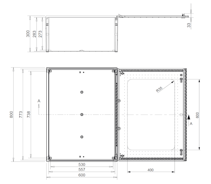• Od góry obudowa posiada wysunięty daszek który zabezpiecza przed wnikaniem wody kiedy drzwi są otwarte. Chroni on również uszczelkę przed długotrwałym kontaktem z cieczami co mogłoby mieć negatywny wpływ na właściwości poliuretanowej uszczelki przy spadkach temperatury.