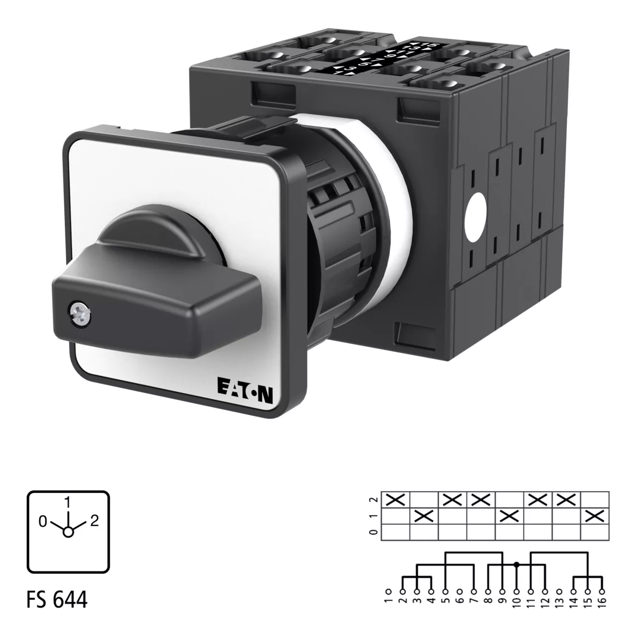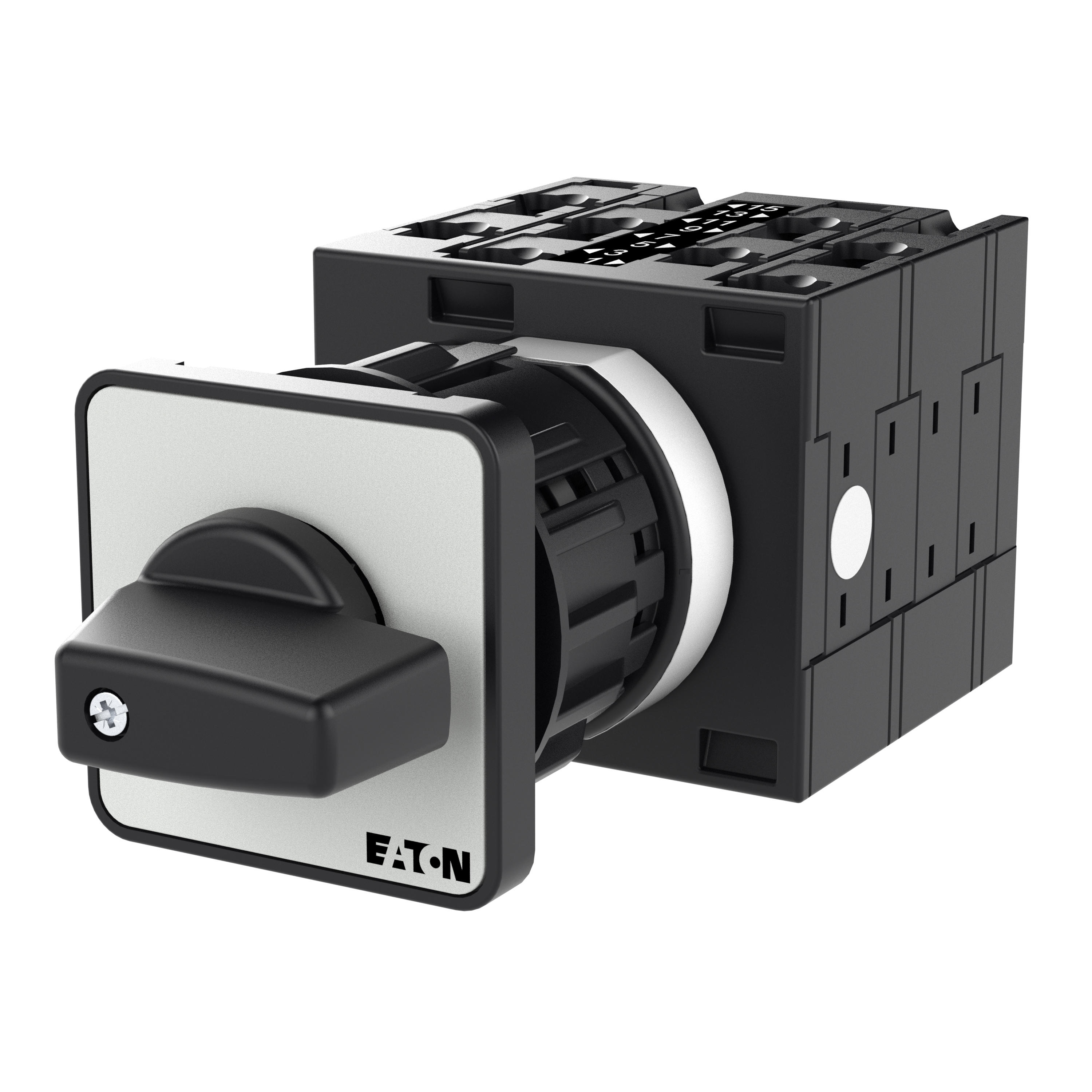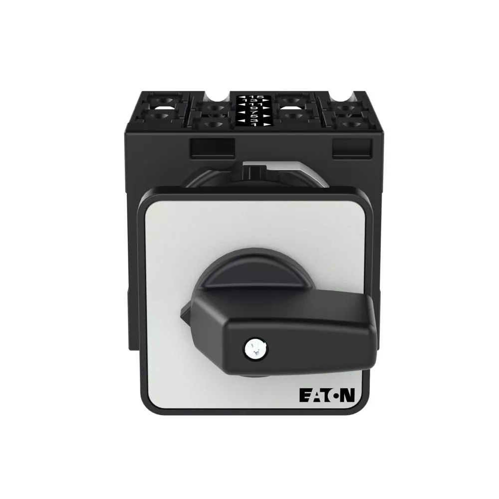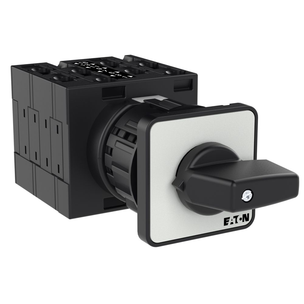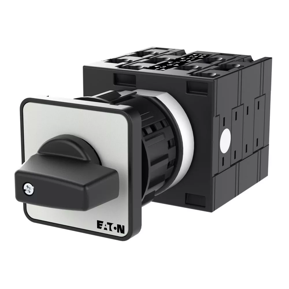 Łącznik krzywkowy wg IEC/EN60947, wielkość konstrukcyjna T3, otwór mocujący o kształcie do montażu centralnego 22,3 mm, tabliczka czołowa 48X48, klasa ochrony na przedzie IP65 z czarnym pokrętłem, pomiarowy prąd stały Iu 32A, znamionowe napięcie pracy Ue 690V, dostępne akcesoria zgodnie z danymi katalogu łączników krzywkowych T