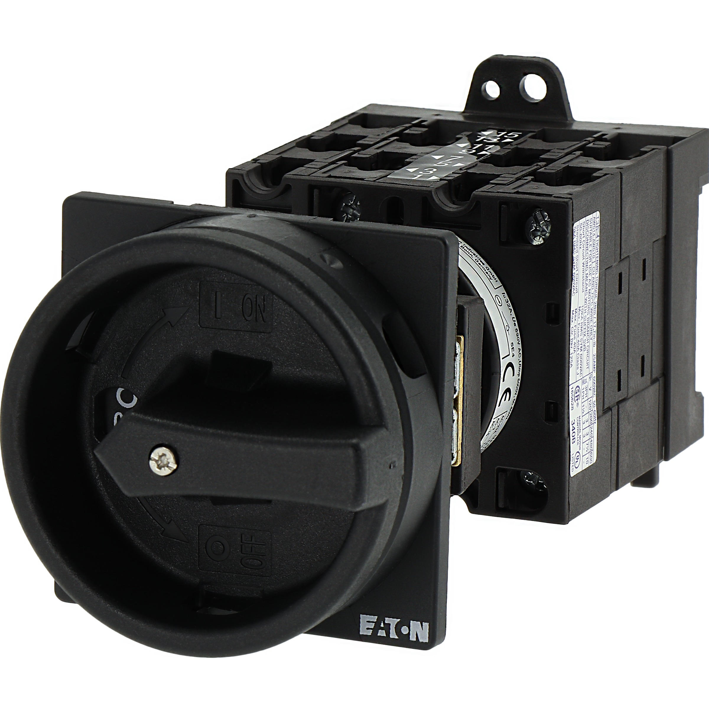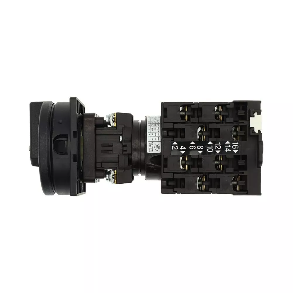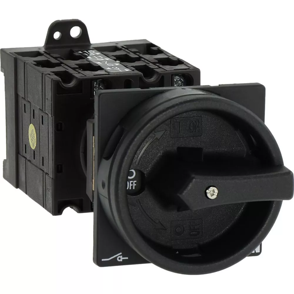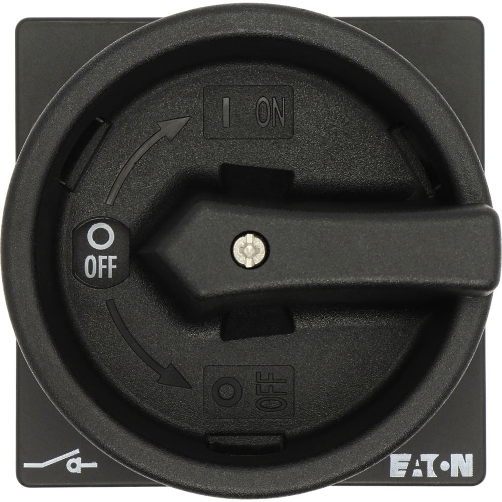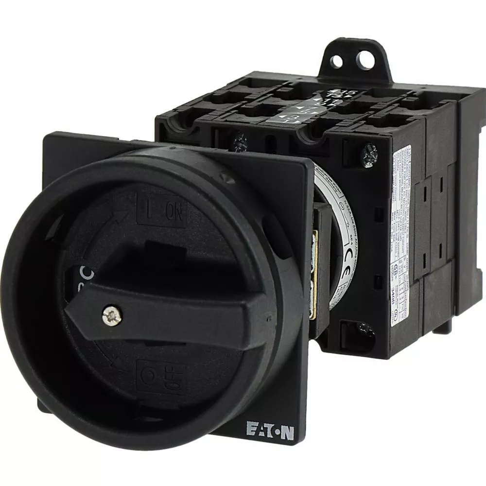Wyłącznik główny wg IEC/EN60947, wielkość konstrukcyjna T3, konstrukcja pośrednia, klasa ochrony na przedzie IP65 z czarną rękojeścią i wieńcem blokującym zamykanie w położeniu zerowym, pomiarowy prąd stały Iu 32A, znamionowe napięcie pracy Ue 690V, dostępne akcesoria zgodnie z danymi katalogu łączników krzywkowych T