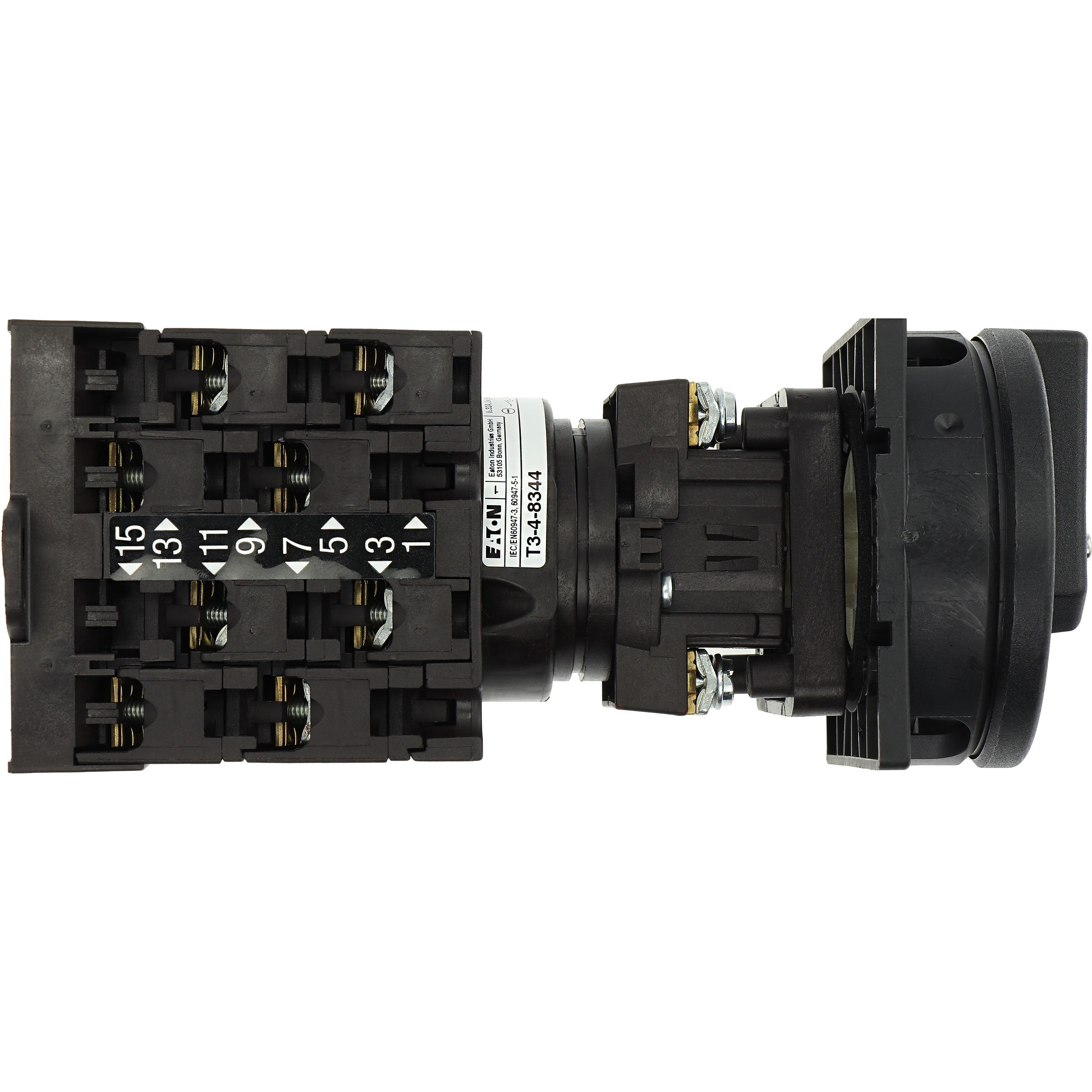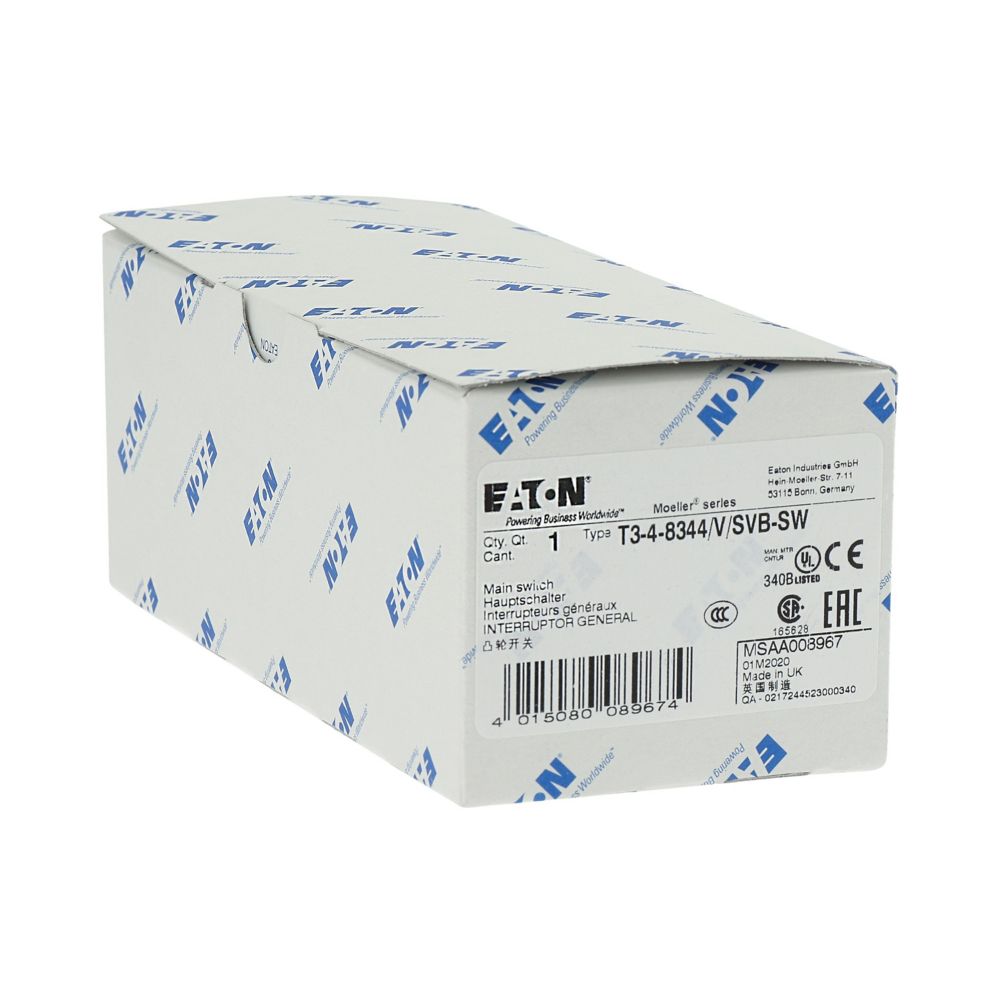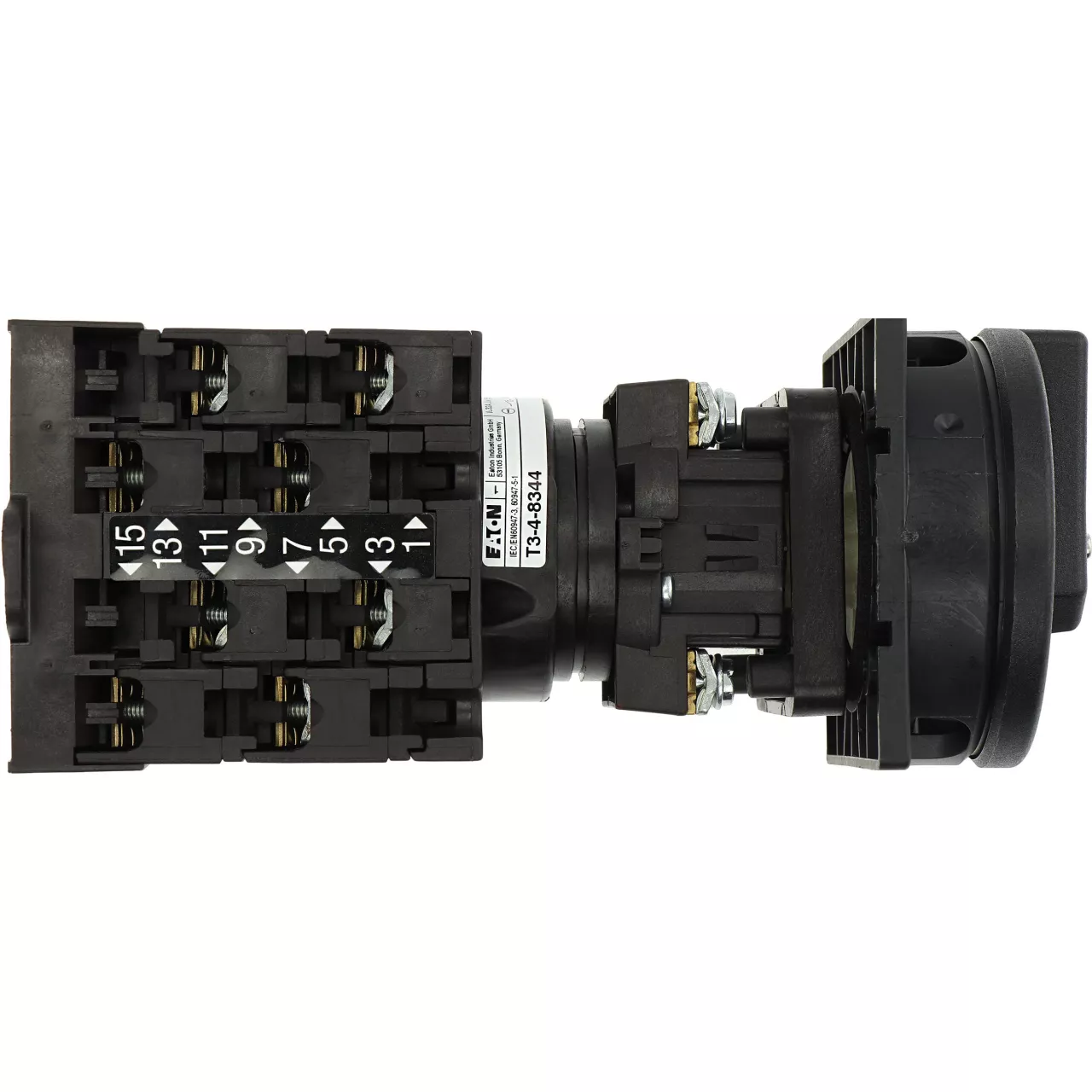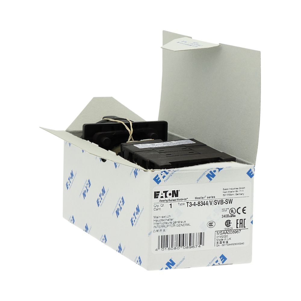 T3-4-8344/V/SVB-SW Rozłącznik główny, 8-bieg., 32 A, funkcja awaryjnego zatrzymania, 90 °, blok. na kłódkę w pozycji Wył., montaż rozłączny, pokrętło czarne z blokadą na kłódkę