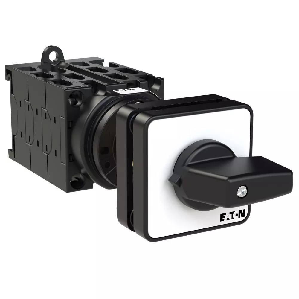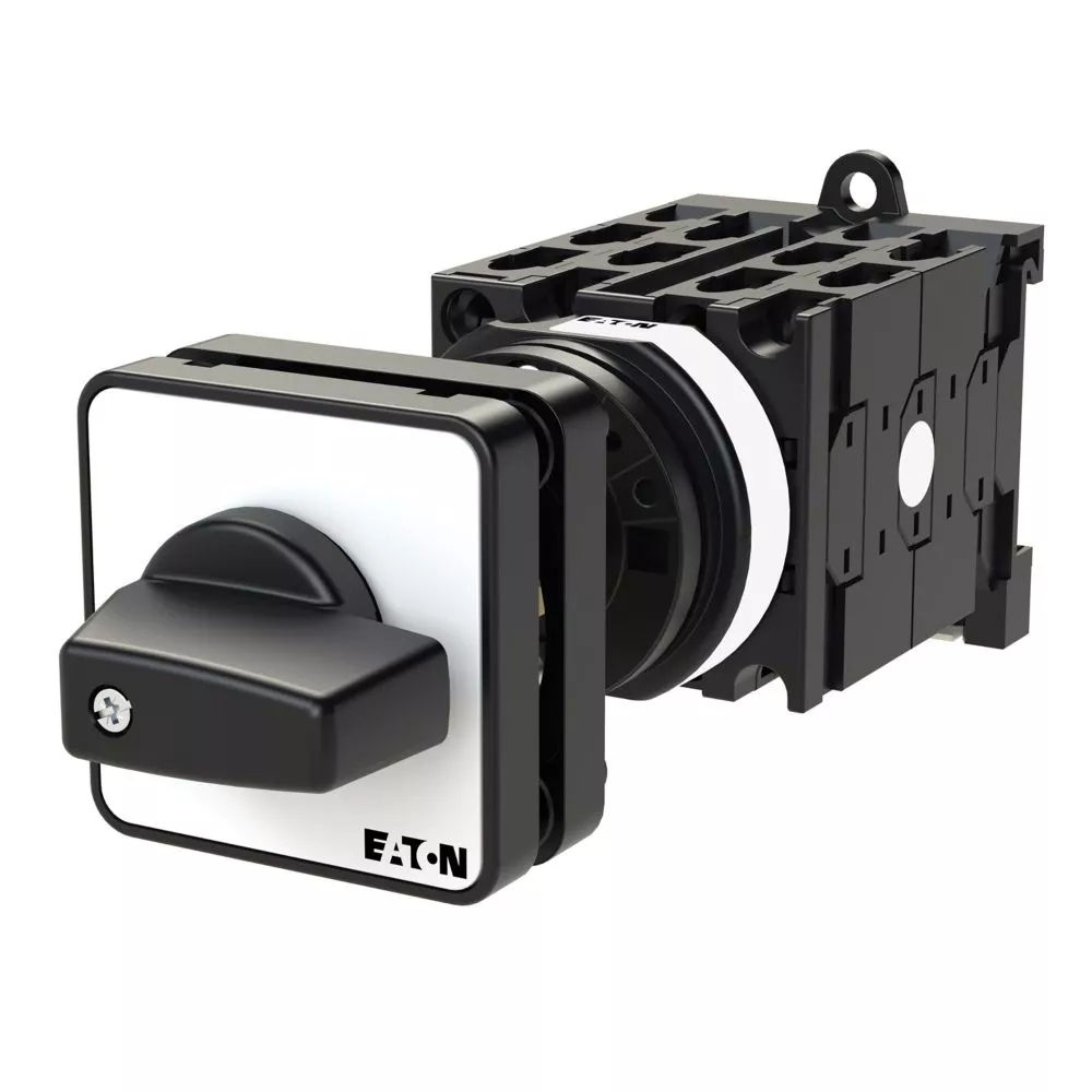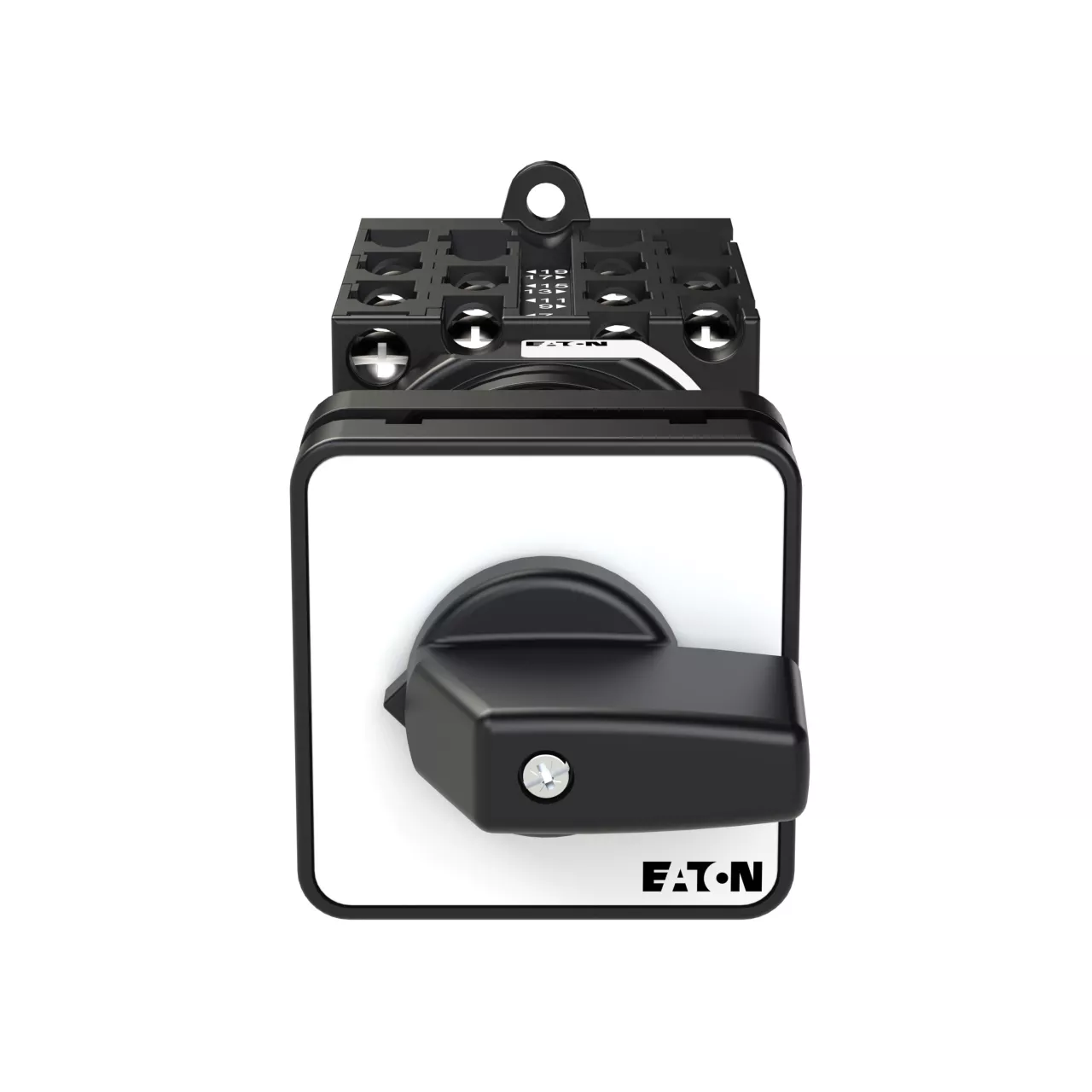 Łącznik krzywkowy wg IEC/EN60947, wielkość konstrukcyjna T0, konstrukcja pośrednia, mocowanie przykręcane zatrzaskowe, napęd sprzęgowy drzwi i pokrywy, tabliczka czołowa 48X48, klasa ochrony na przedzie IP65 z czarnym pokrętłem, pomiarowy prąd stały Iu 20A, znamionowe napięcie pracy Ue 690V, dostępne akcesoria zgodnie z danymi katalogu łączników krzywkowych T. Konstrukcja ogólna: obudowa natynkowa z izolacją, montaż, montaż centralny, montaż pośredni montaż rozdzielacza IVS.