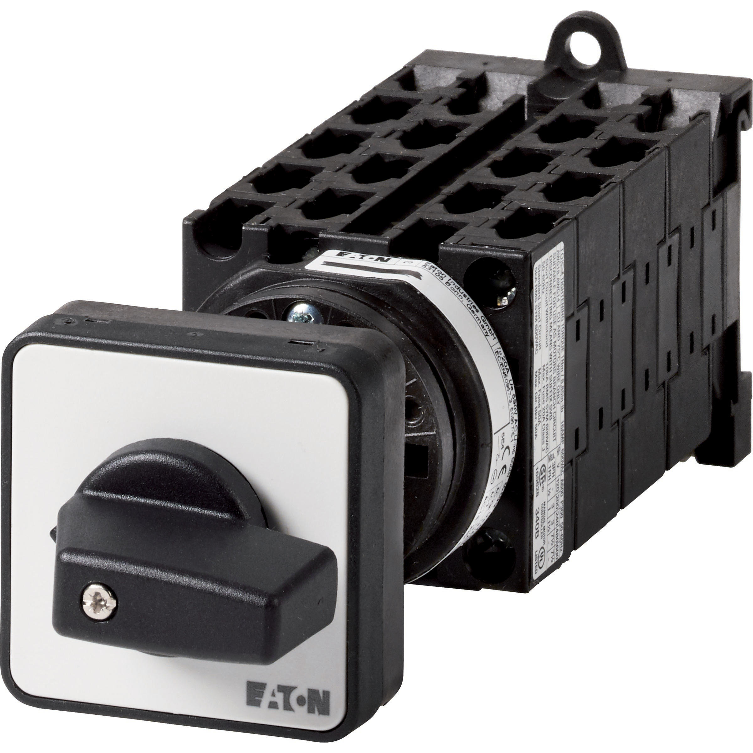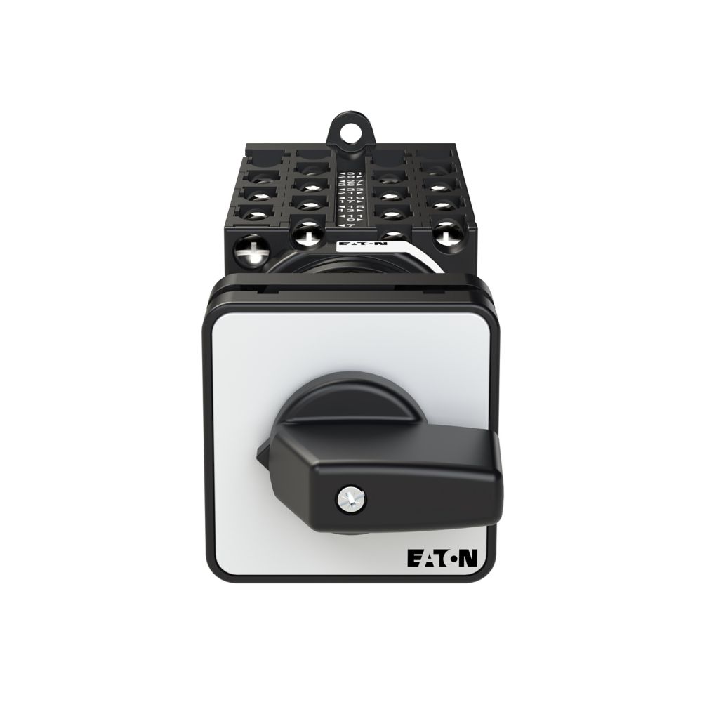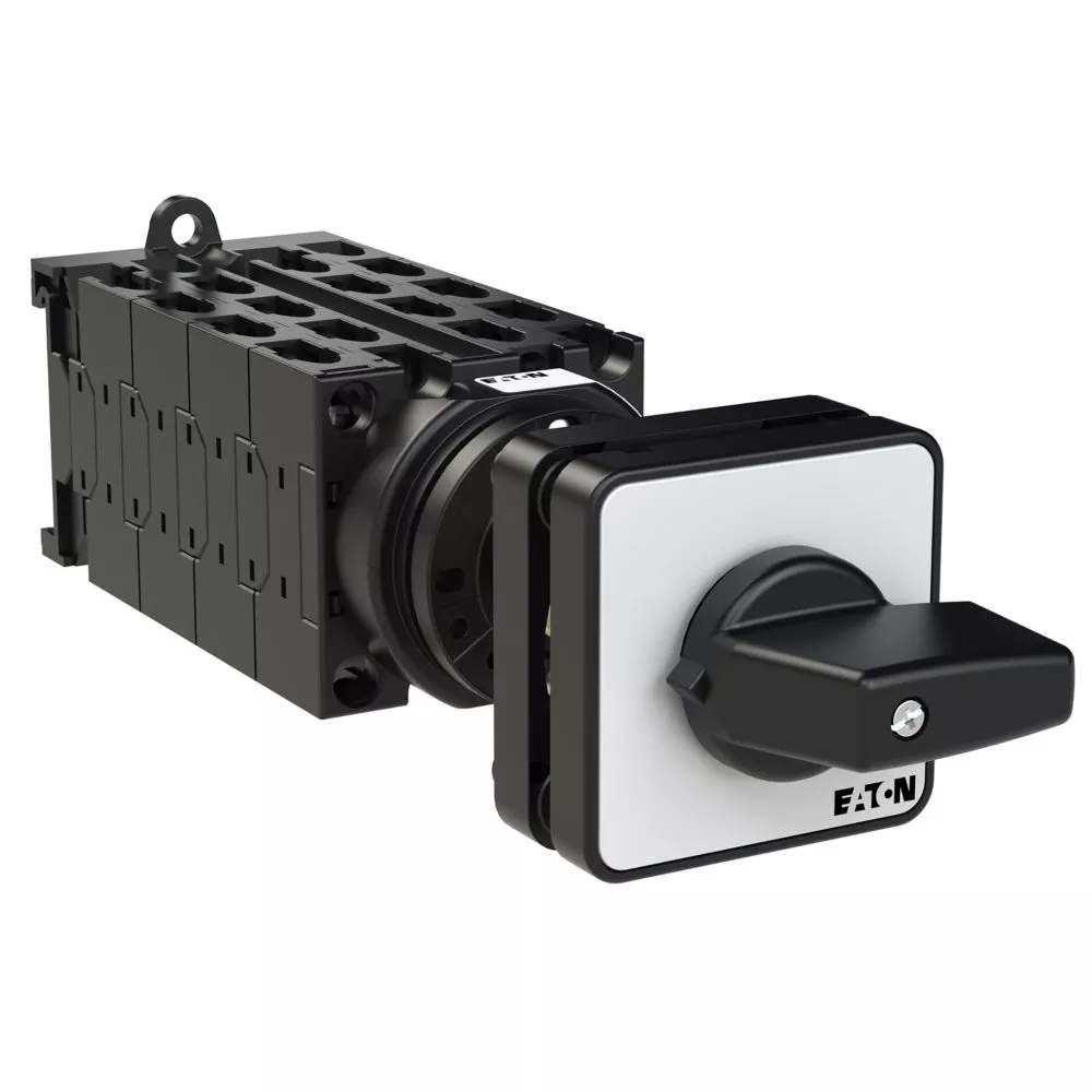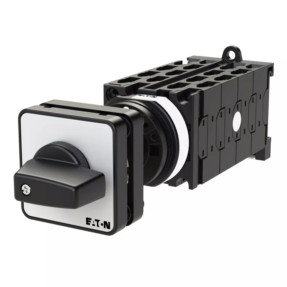 Łącznik krzywkowy wg IEC/EN60947, wielkość konstrukcyjna T0, konstrukcja pośrednia, mocowanie przykręcane zatrzaskowe, napęd sprzęgowy drzwi i pokrywy, tabliczka czołowa 48X48, klasa ochrony na przedzie IP65 z czarnym pokrętłem, pomiarowy prąd stały Iu 20A, znamionowe napięcie pracy Ue 690V, dostępne akcesoria zgodnie z danymi katalogu łączników krzywkowych T. Konstrukcja ogólna: obudowa natynkowa z izolacją, montaż, montaż centralny, montaż pośredni montaż rozdzielacza IVS.