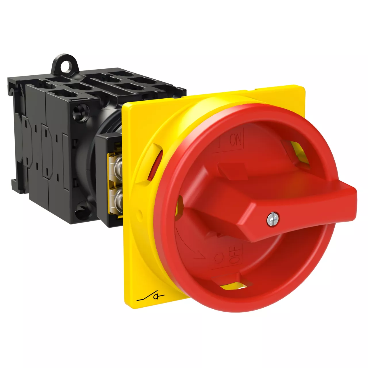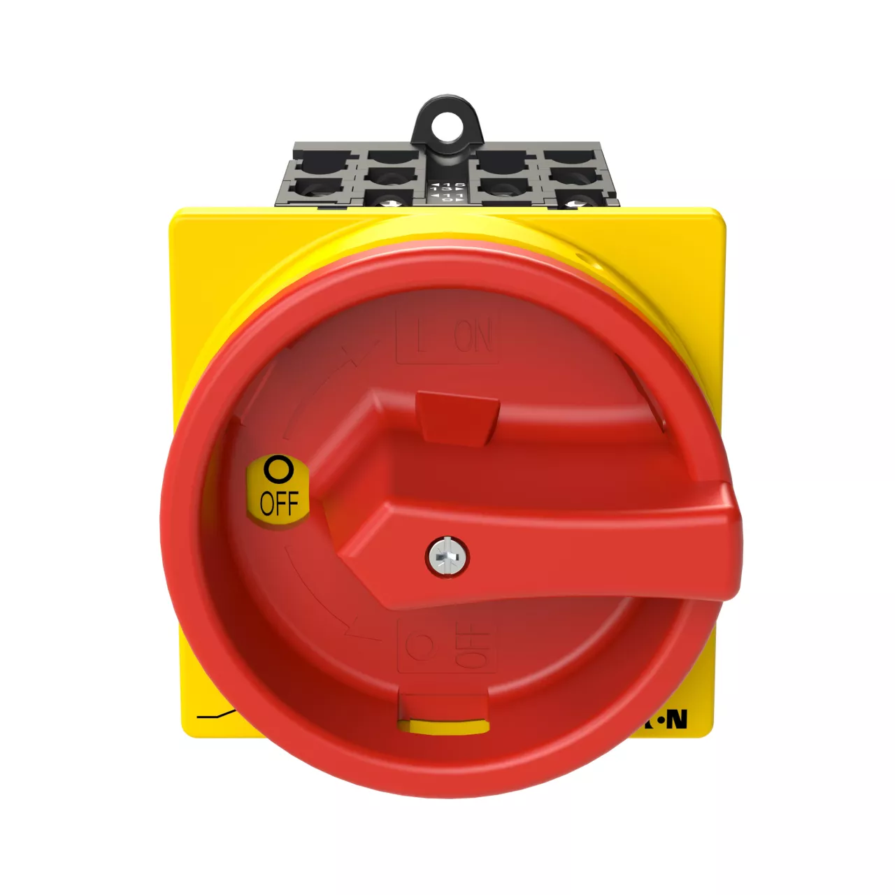 Wyłącznik główny wg IEC/EN60947, wielkość konstrukcyjna T0, konstrukcja pośrednia, klasa ochrony na przedzie IP65 z czerwoną rękojeścią i żółtym wieńcem blokującym zamykanie w położeniu zerowym, pomiarowy prąd stały Iu 20A, znamionowe napięcie pracy Ue 690V, dostępne akcesoria zgodnie z danymi katalogu łączników krzywkowych T. Konstrukcja ogólna: obudowa natynkowa z izolacją, montaż, montaż centralny, montaż pośredni montaż rozdzielacza IVS.