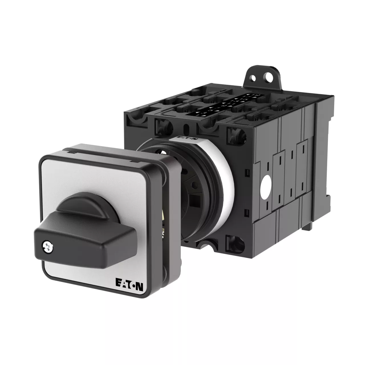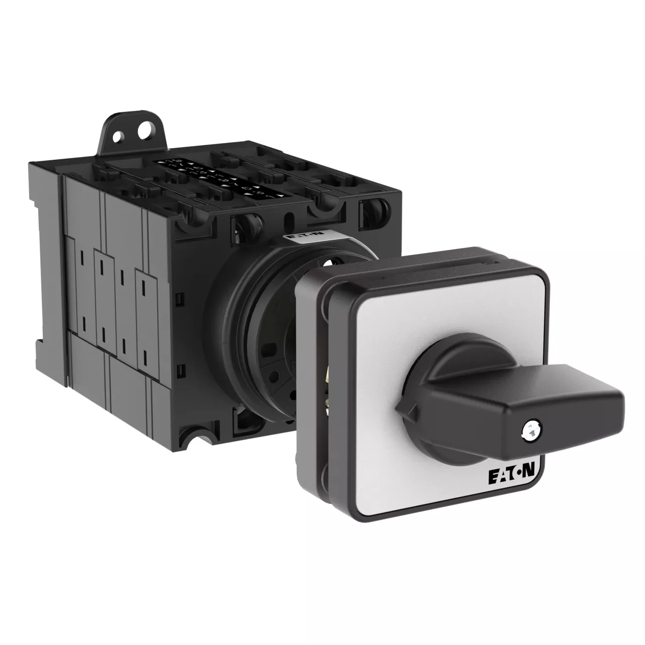 Łącznik krzywkowy wg IEC/EN60947, wielkość konstrukcyjna T3, konstrukcja pośrednia, mocowanie przykręcane zatrzaskowe, napęd sprzęgowy drzwi i pokrywy, tabliczka czołowa 48X48, klasa ochrony na przedzie IP65 z czarnym pokrętłem, pomiarowy prąd stały Iu 32A, znamionowe napięcie pracy Ue 690V, dostępne akcesoria zgodnie z danymi katalogu łączników krzywkowych T