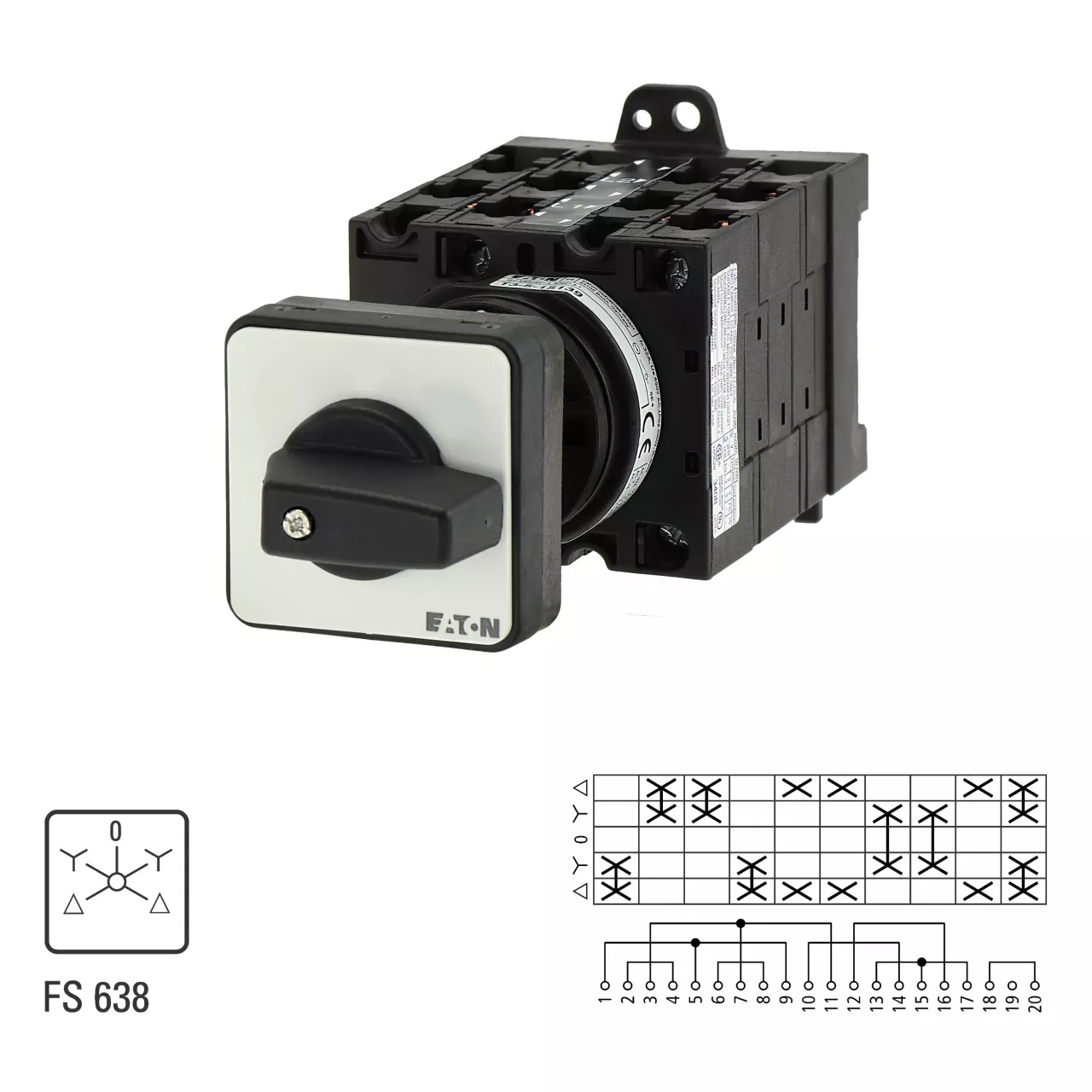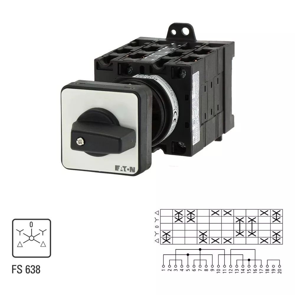 T3-5-15876/Z Przełącznik nawrotny gwiazda-trójkąt, Styki: 10, 32 A, tabliczka: D-Y-0-Y-D, 60 °, bez samopowrotu, montaż rozłączny, pokrętło czarne bez możliwości blokady